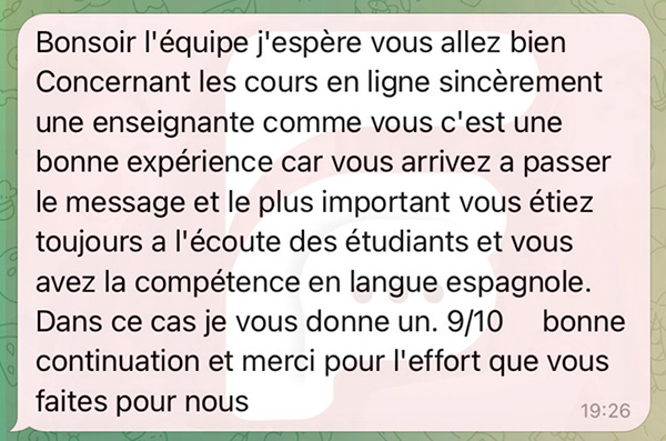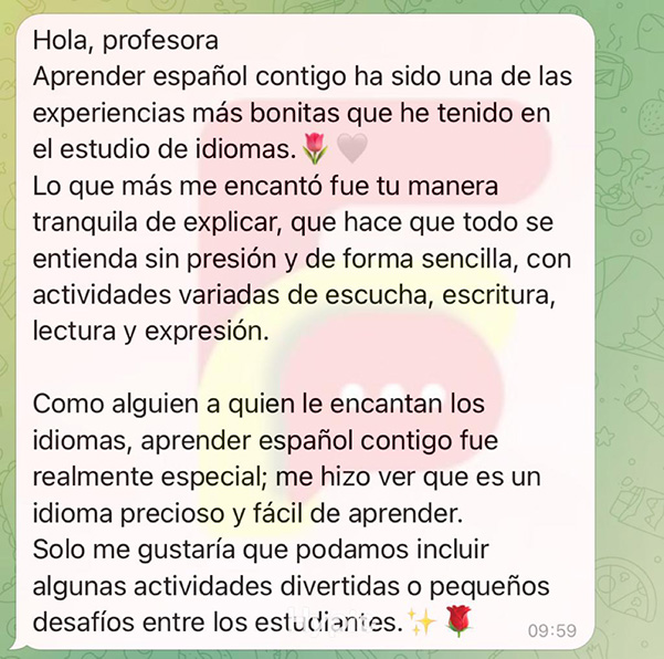 يبقى فريقنا الأكاديمي على تواصل دائم معك لمتابعة تقدمك، وتقديم الملاحظات والإرشادات لضمان أفضل نتائج في تعلم اللغة الإسبانية.