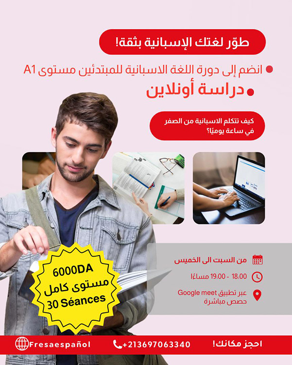 اكتشف مستوى لغتك الإسبانية في أقل من 5 دقائق عبر اختبار مجاني وفوري على واتساب.ابدأ الآن واحصل على تقييم دقيق ونصيحة لمستواك المناسب.