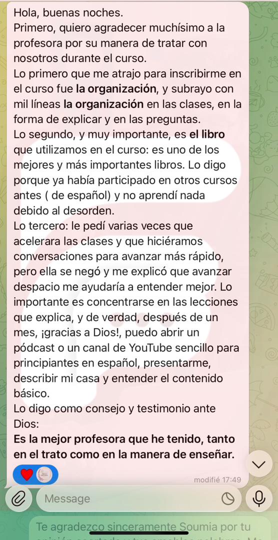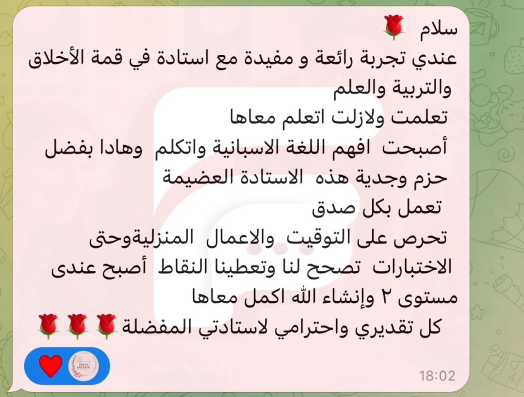يبقى فريقنا الأكاديمي على تواصل دائم معك لمتابعة تقدمك، وتقديم الملاحظات والإرشادات لضمان أفضل نتائج في تعلم اللغة الإسبانية.